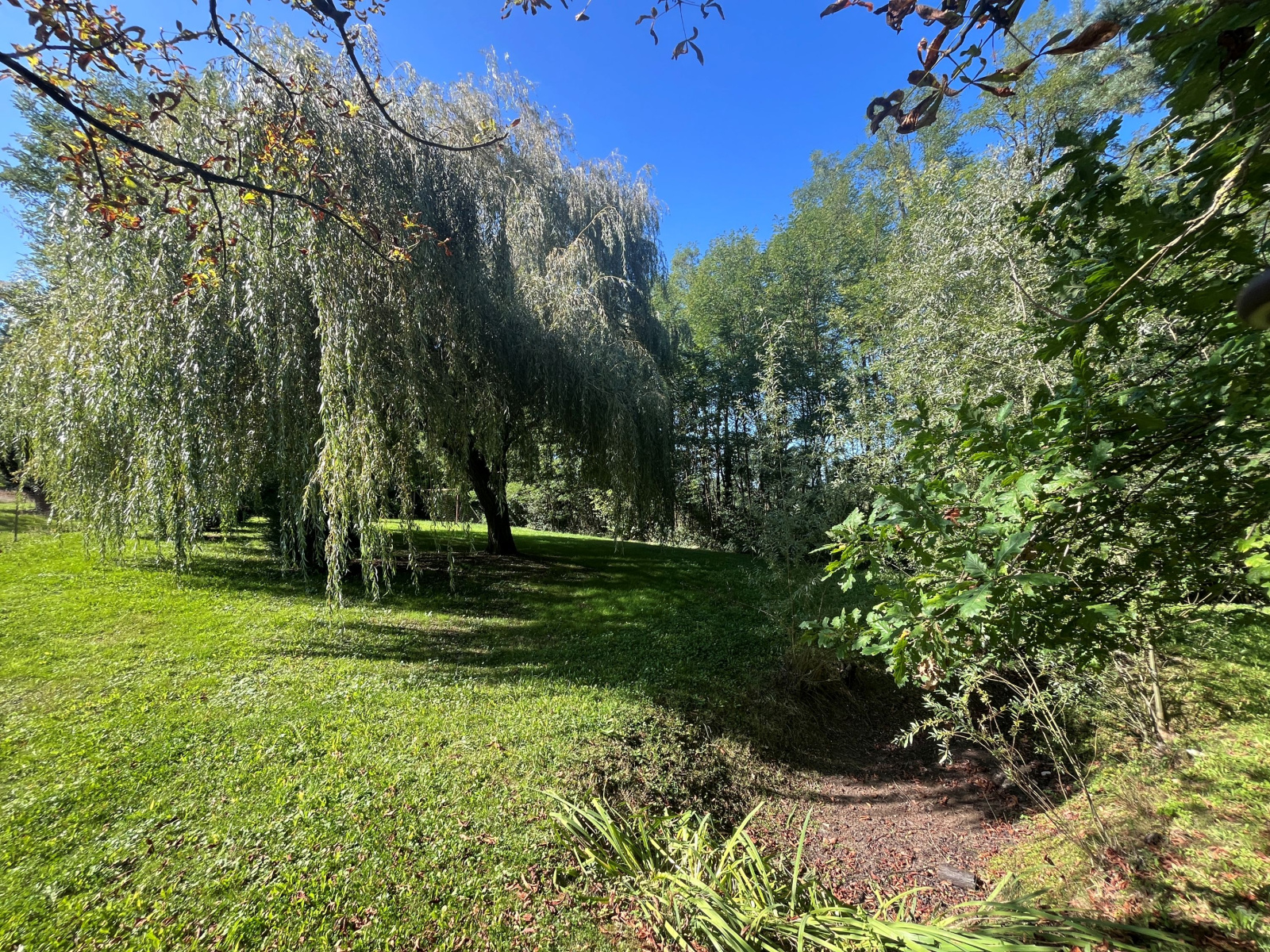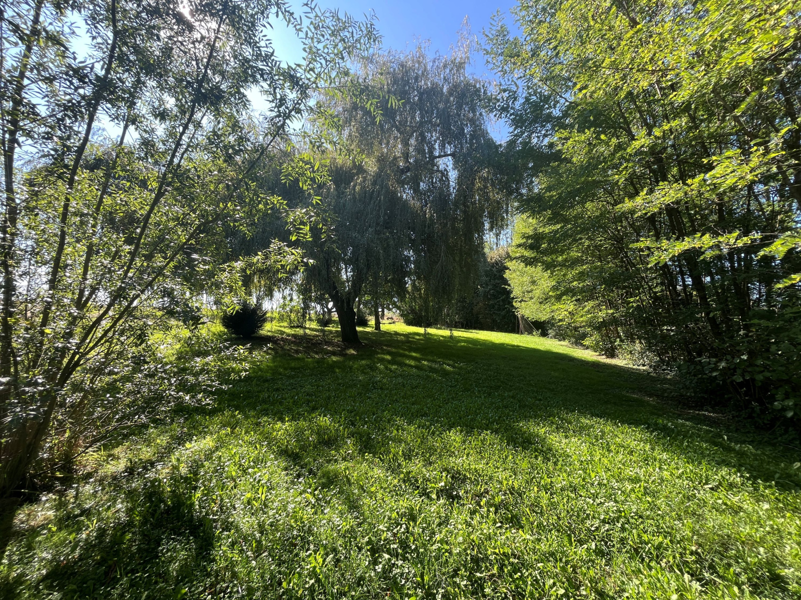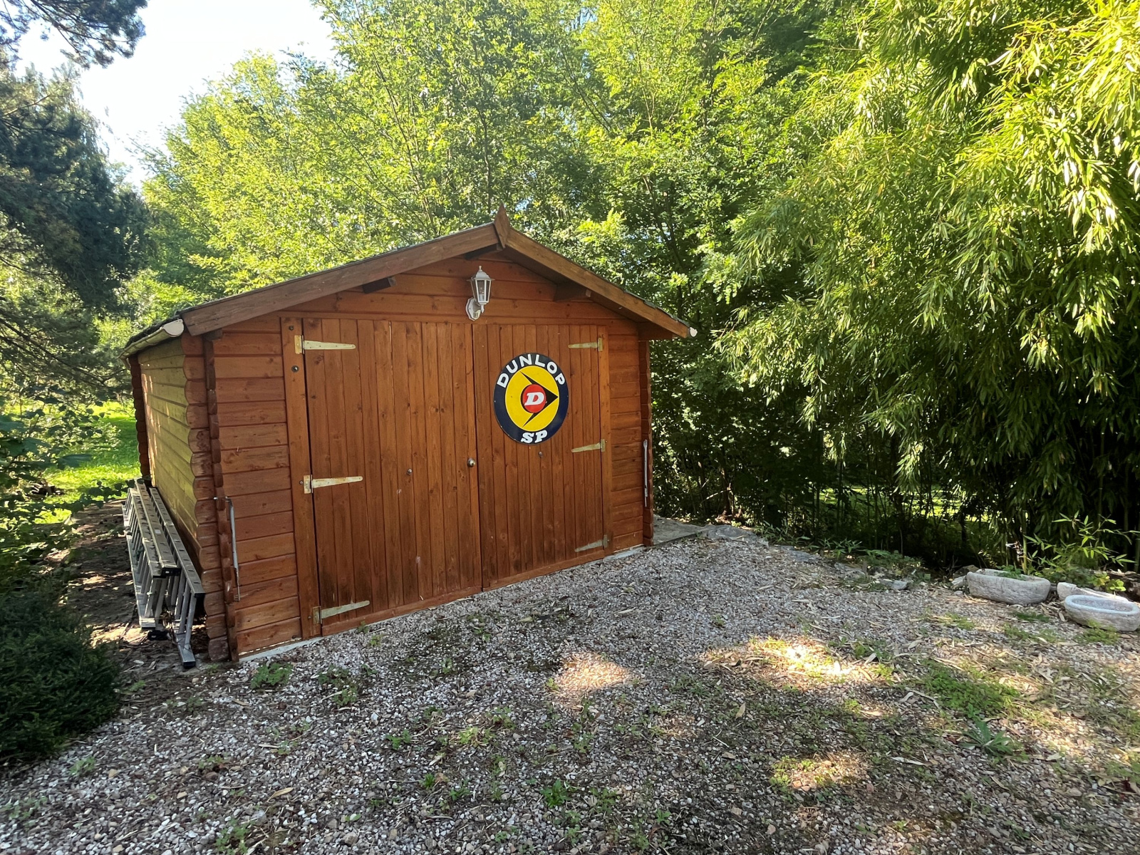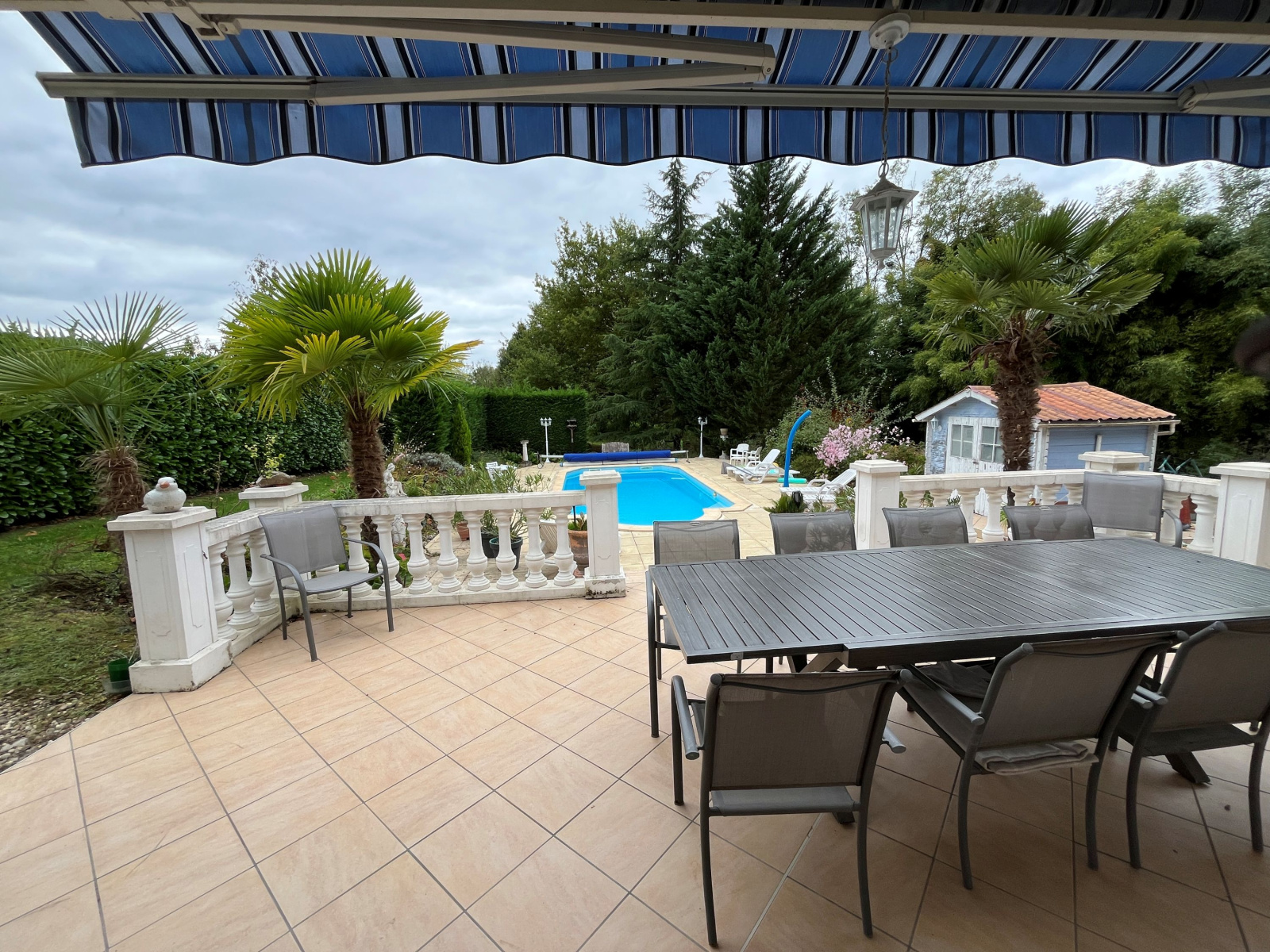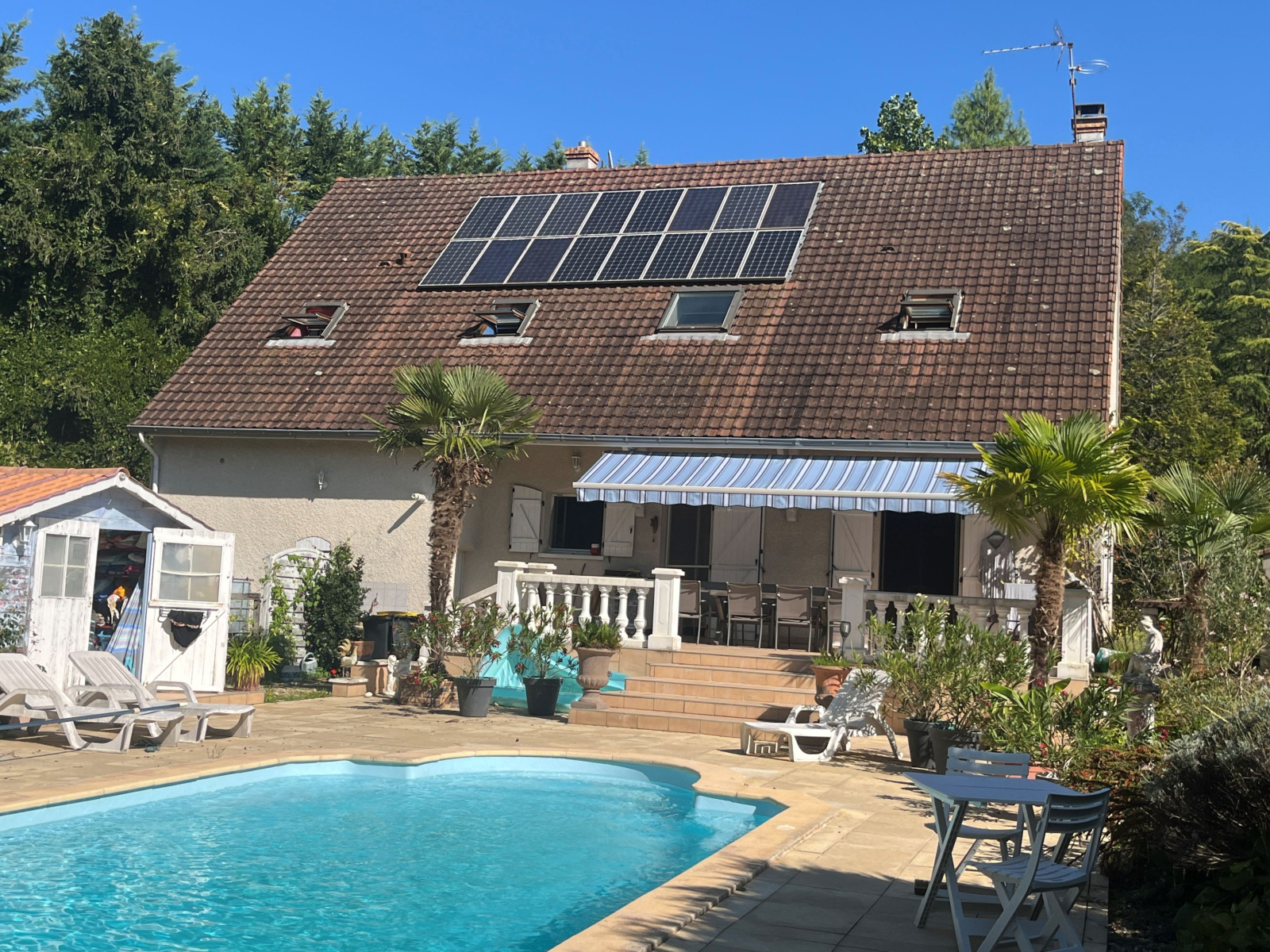 Terrain avec de très beaux arbres, piscine, et abris technique.
